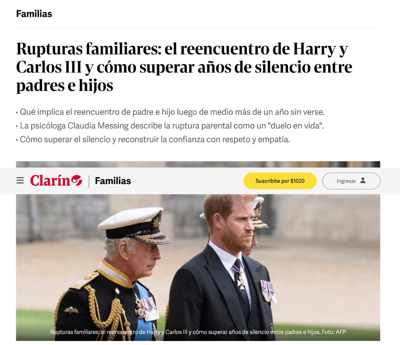 11.09.25. Nota publicada en el diario Clarín Familias: “Rupturas familiares: el reencuentro de Harry y Carlos III y cómo superar años de silencio entre padres e hijos”.