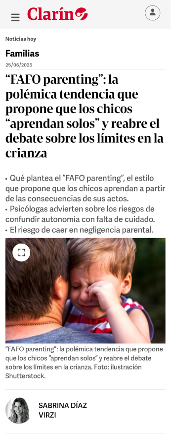 25.03.2026. Colaboración en artículo de Clarín Familias: “FAFO parenting”: la polémica tendencia que propone que los chicos “aprendan solos” y reabre el debate sobre los límites en la crianza Publicado el 30 marzo, 202630 marzo, 2026 por admin en Uncategorized Link a nota en Clarín Familias Leer nota completa en PDF